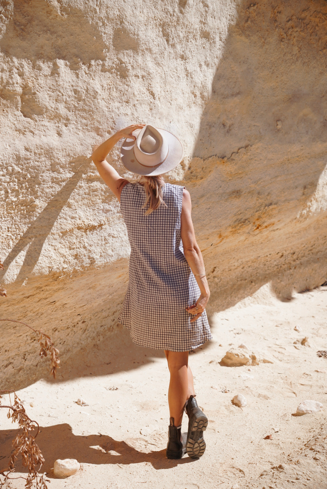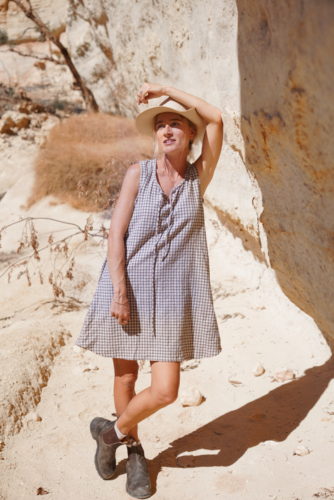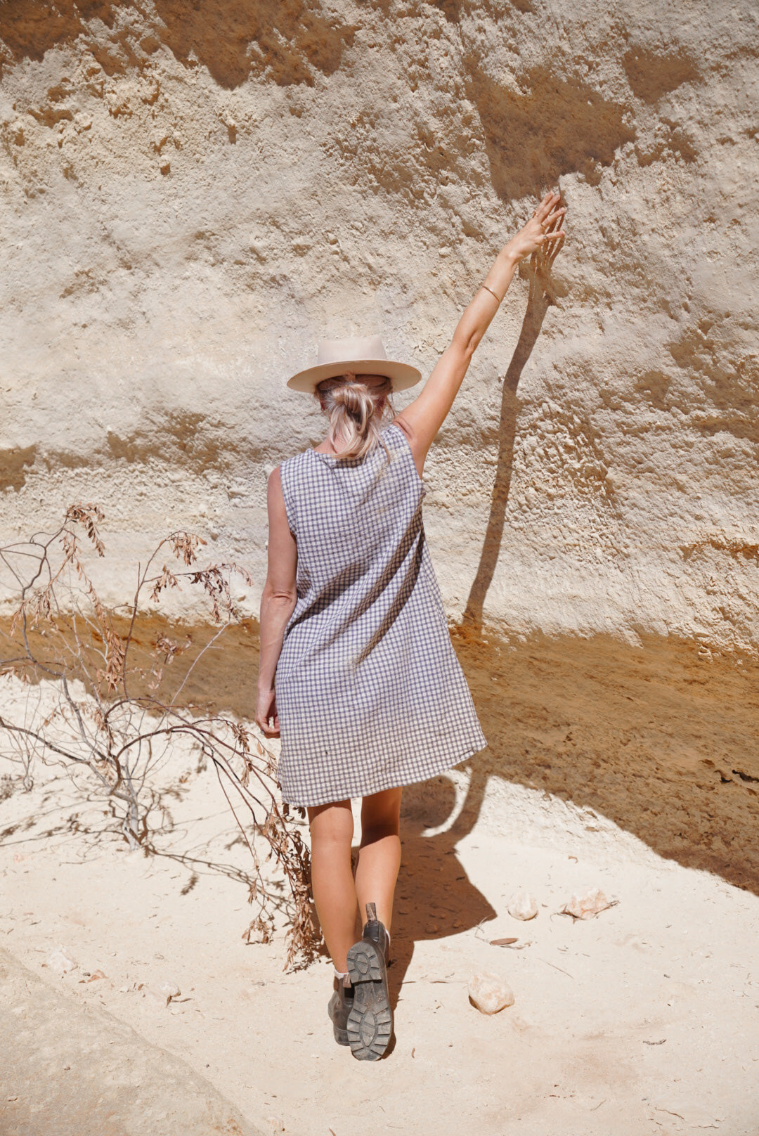 Effortless and breezy, this sleeveless gingham dress is your perfect throw-on-and-go piece. Designed by us in  WA and made from soft, breathable linen cotton blend it features a flattering loose fit, functional side pockets, and a gentle neckline tie detail. Easy to wear and perfect for our coastal lifestyle