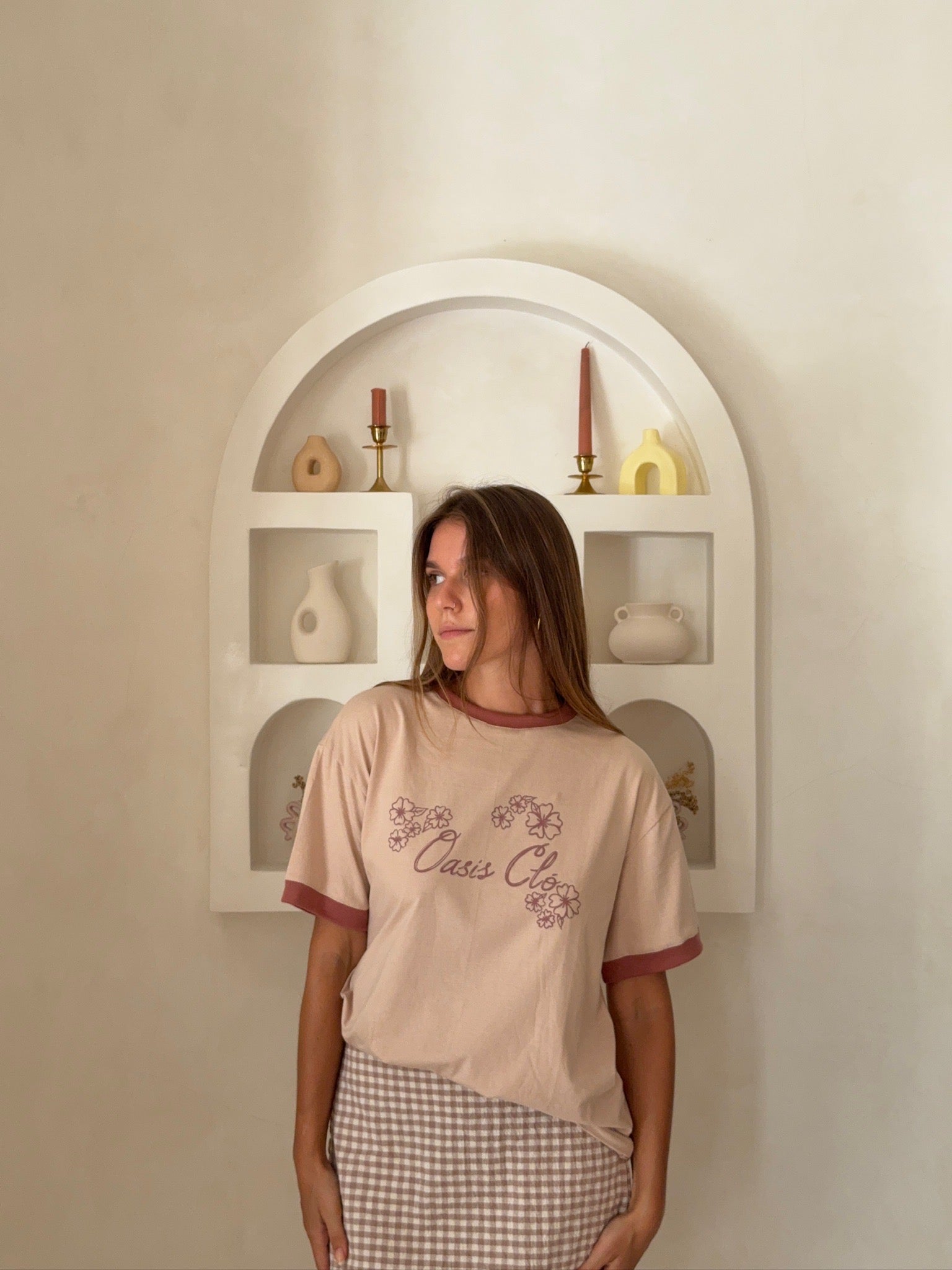 An easy everyday tee with a relaxed, vintage feel. This handmade oversized T-shirt features a delicate hand-drawn floral design with soft contrast ribbing at the neckline and sleeves for a subtle retro touch.