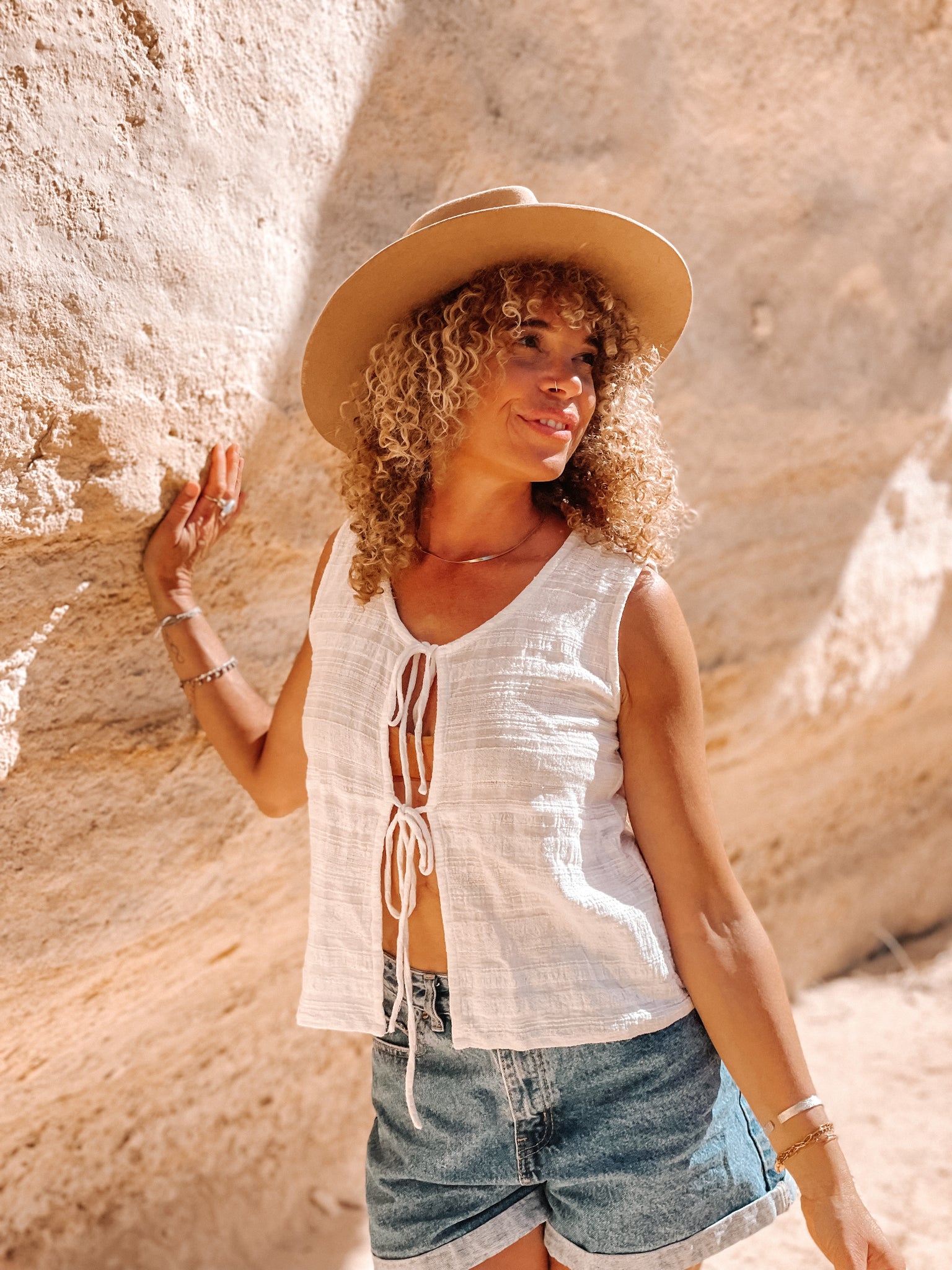 Breezy and effortlessly coastal, this sleeveless top is crafted from natural cotton with a beautifully textured weave. Featuring a flattering open front with adjustable tie closures and soft tassel details, it’s perfect for layering over swimwear or pairing with high-waisted shorts.